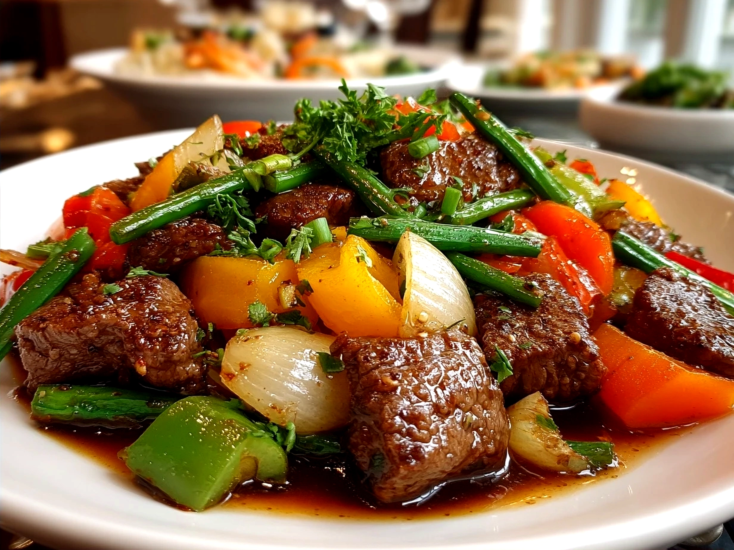 The beef should be browned outside but still tender and juicy inside, with vibrant, crisp-tender peppers. The sauce will be glossy and thickened just enough to coat.