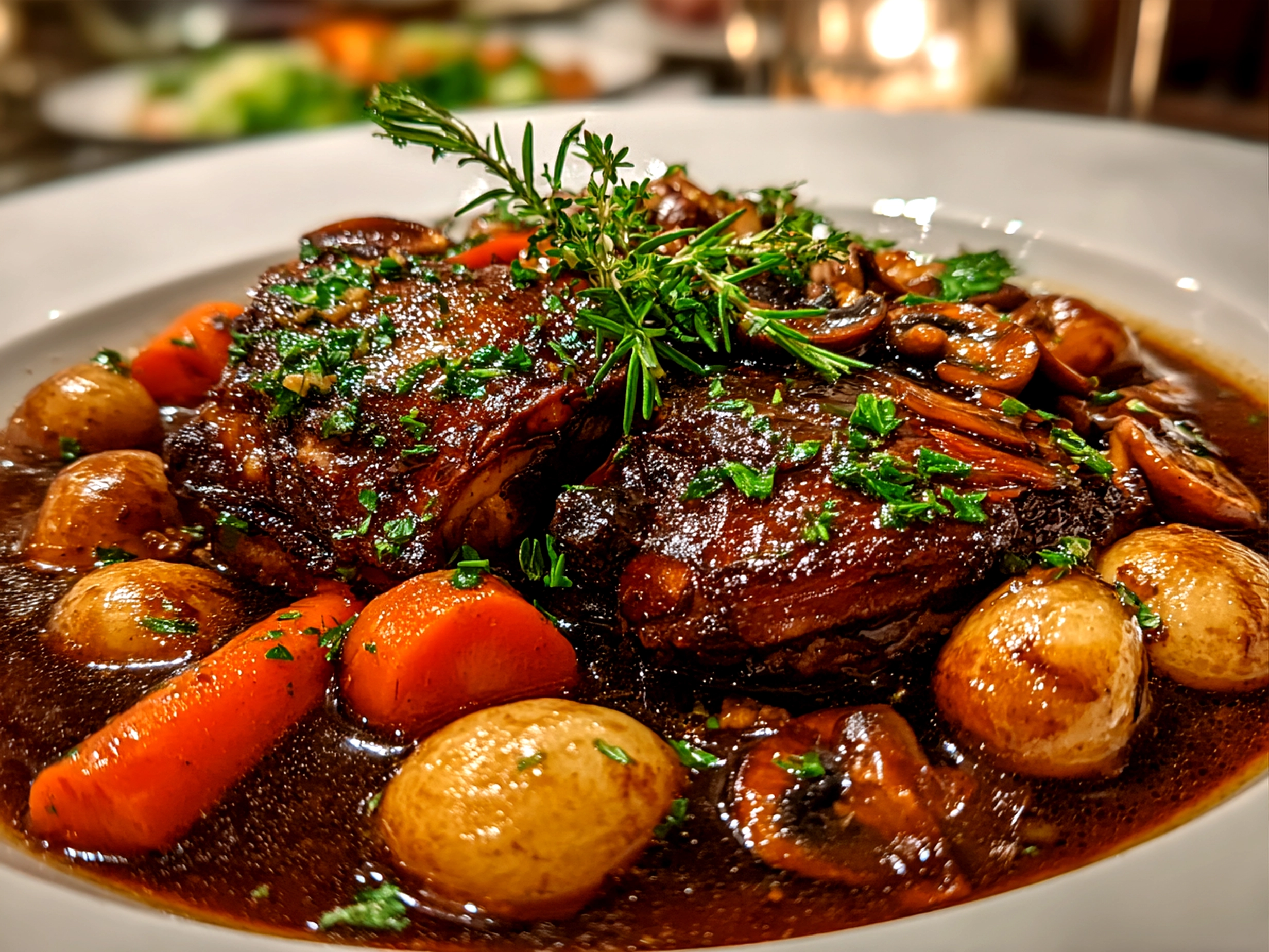 Coq au Vin Classic Chicken is a rich and flavorful French dish featuring tender chicken braised in red wine with mushrooms, bacon, and aromatic herbs, perfect for an elegant dinner.