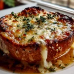 Classic French Onion Soup features rich caramelized onions simmered in savory beef broth, topped with toasted baguette slices and melted cheese for a comforting and flavorful meal.