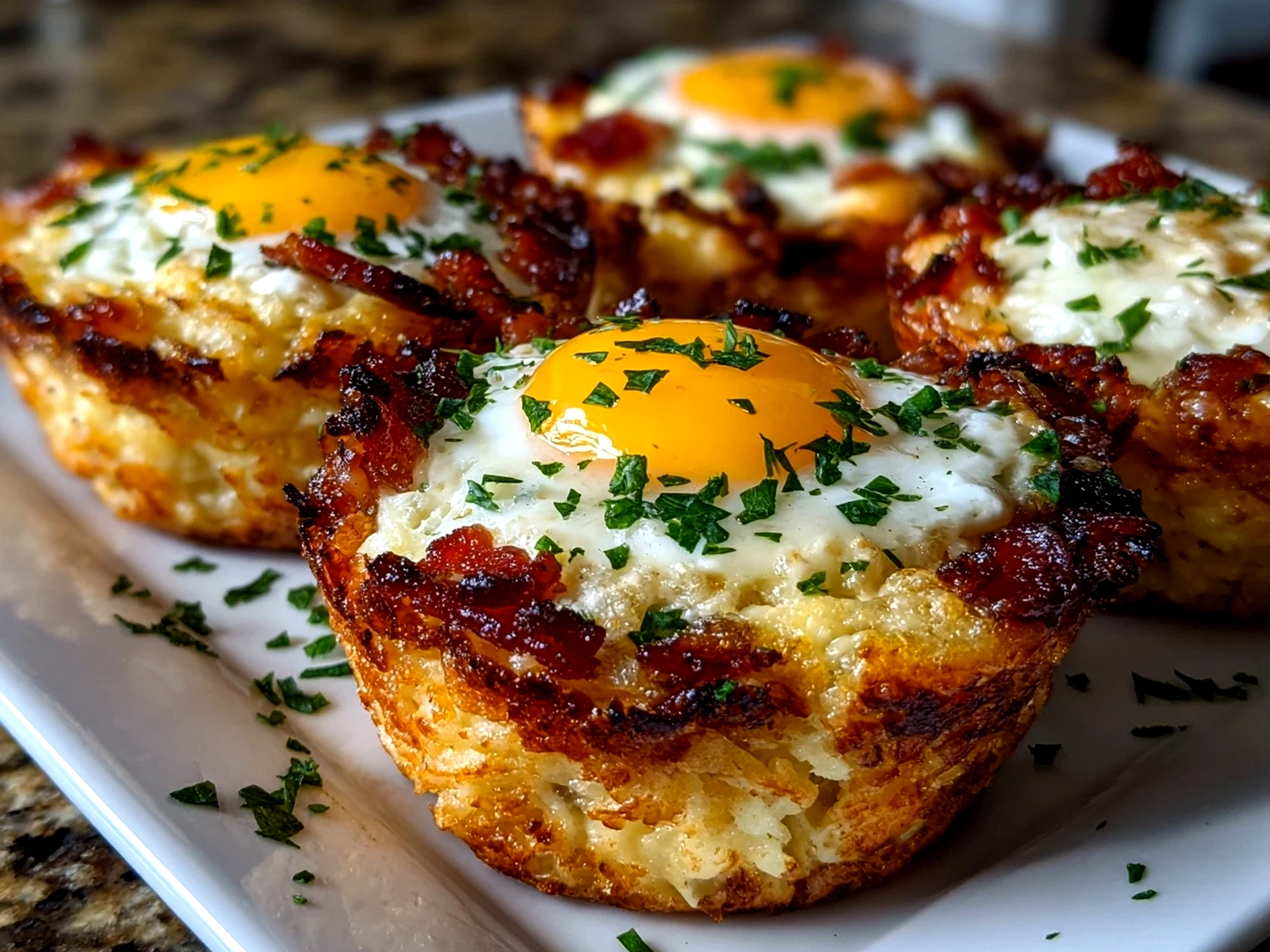 Deliciously crispy hash brown muffins loaded with savory bacon and fluffy eggs, perfect for a hearty breakfast or brunch treat.