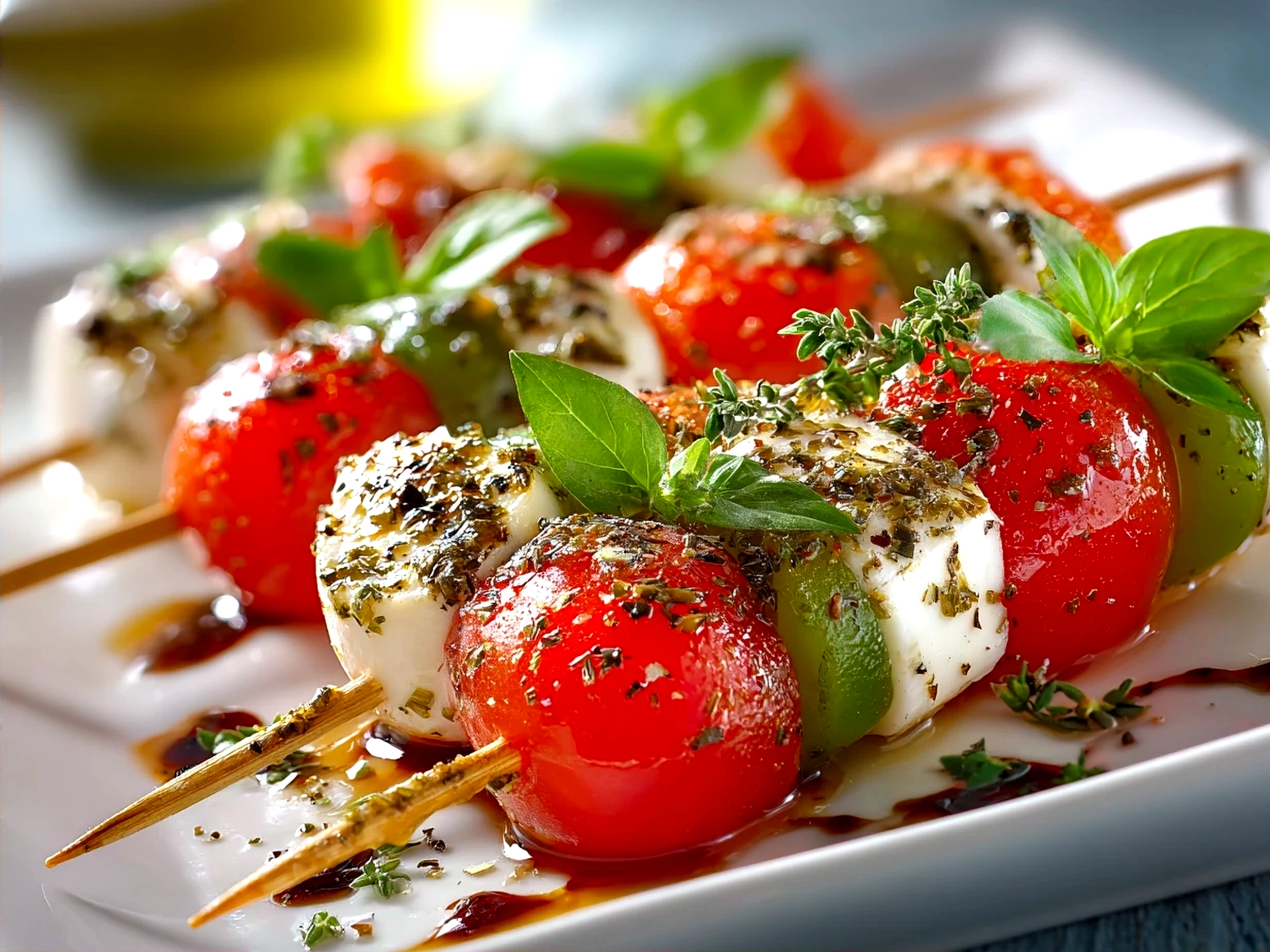 - Drizzle with balsamic glaze: Just before serving, drizzle balsamic glaze lightly over the assembled Red and Green Caprese Skewers. It’s the final touch that adds a gentle sweetness and a glossy presentation.