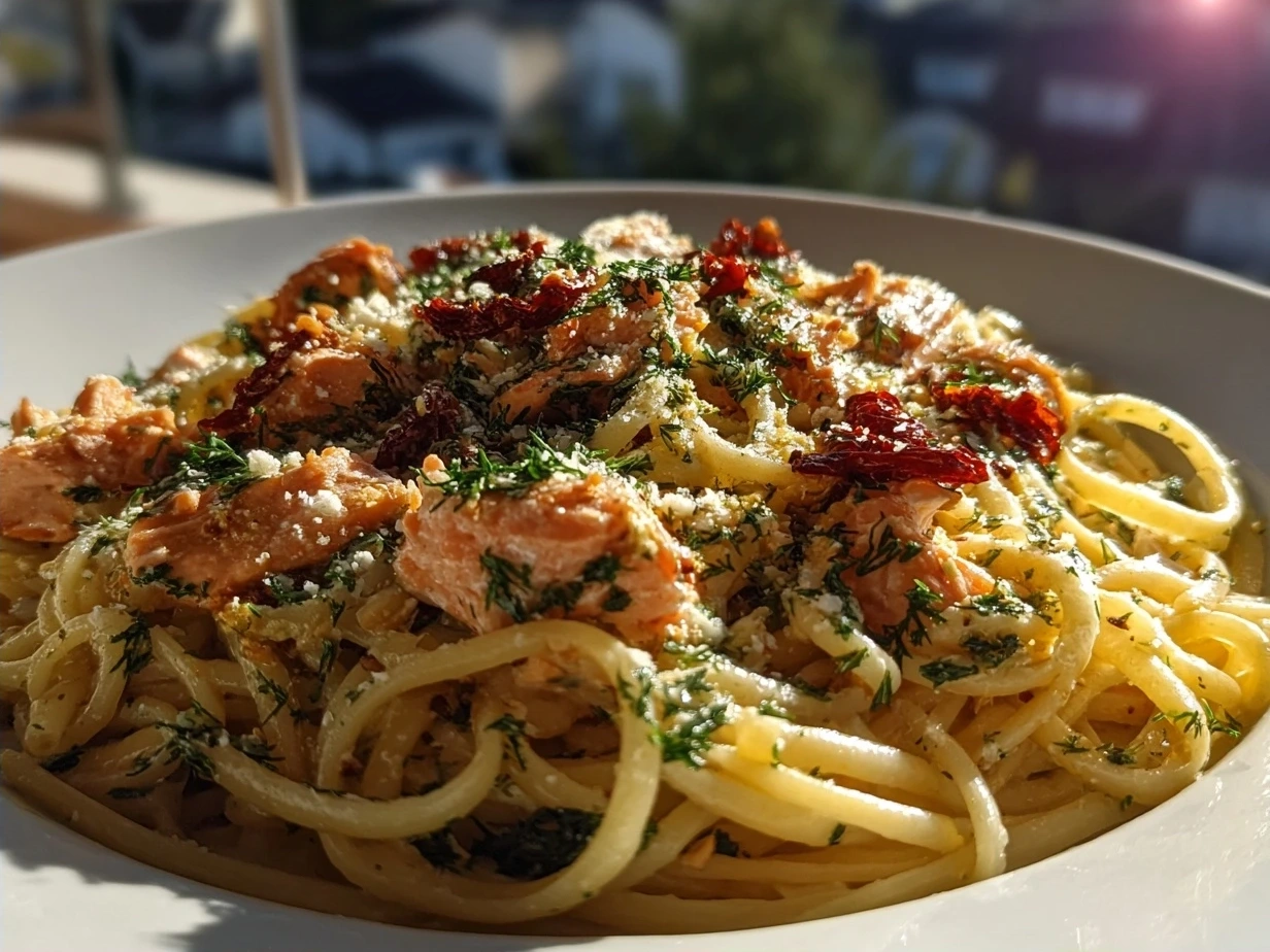 A creamy and flavorful salmon pasta dish enhanced with sundried tomatoes and fresh herbs, perfect for a quick and satisfying Italian-inspired dinner.