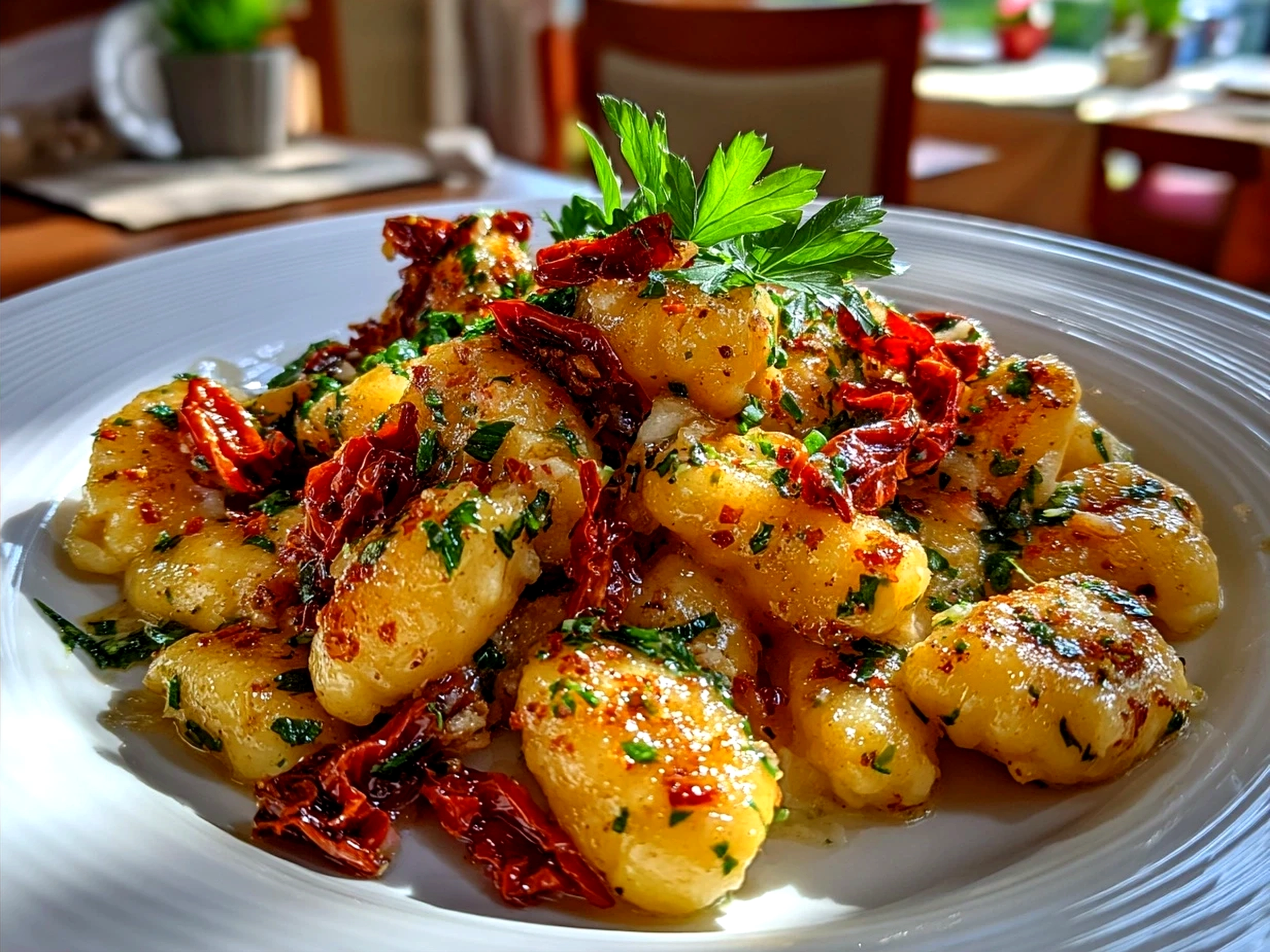 - Make the cream sauce with sun-dried tomatoes: While gnocchi cooks, melt butter in a pan over medium heat. Add garlic and chopped sun-dried tomatoes, cooking for 2 minutes until fragrant. Pour in heavy cream and simmer until slightly thickened to coat gnocchi nicely.