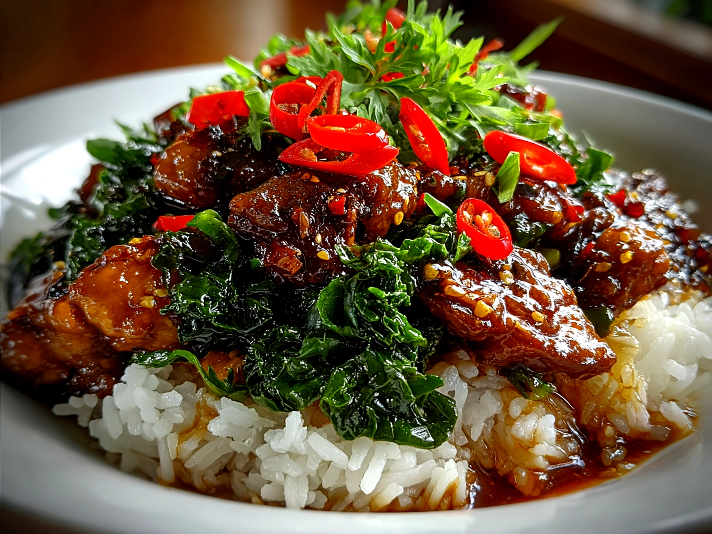 I like to use deep bowls because they hold the rice, chicken, and veggies beautifully together, keeping the sauce in every bite. For a little extra flair, garnish with fresh cilantro or thin slices of red chili for those who like more heat.