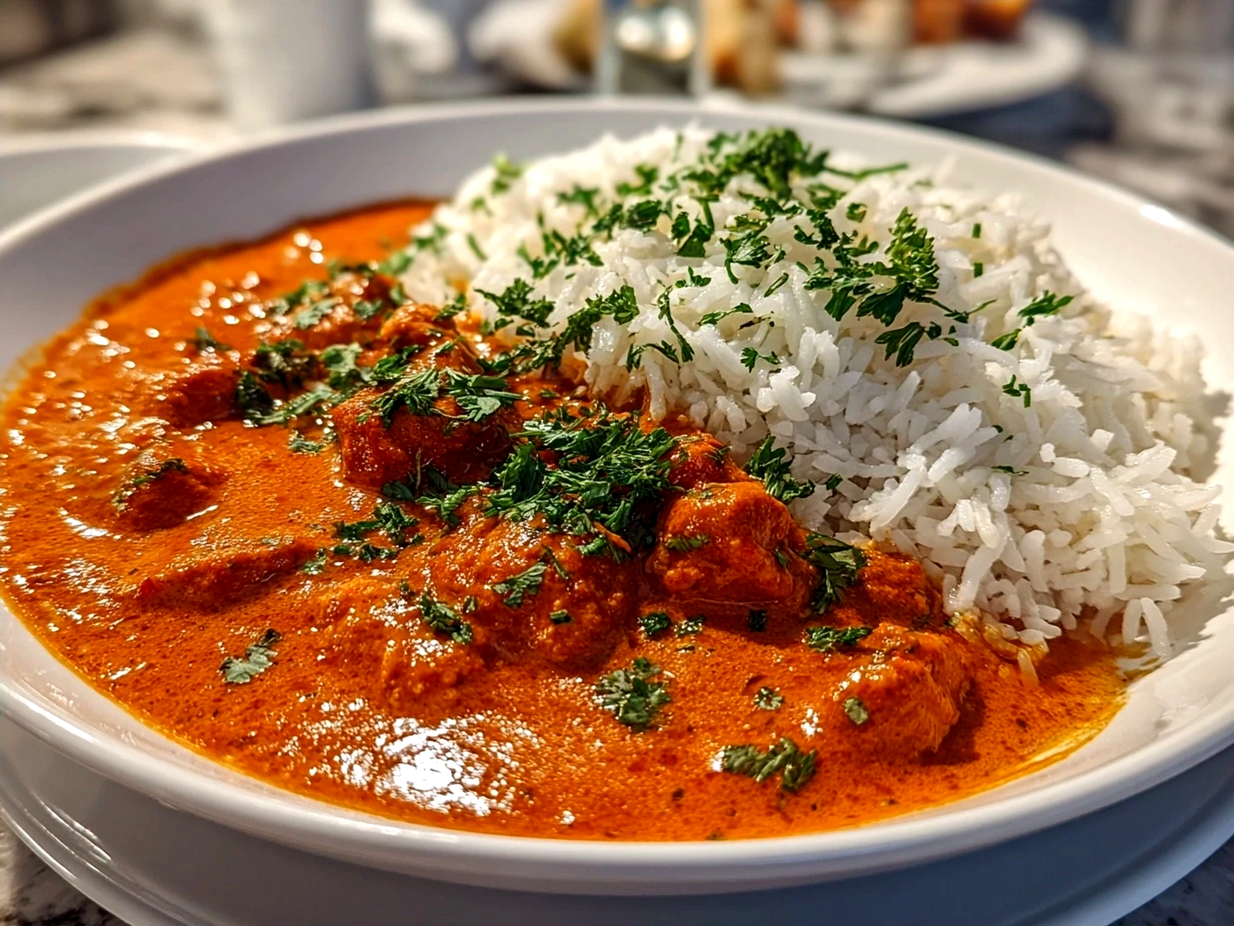 Serving warm Tikka Masala Sauce garnished with fresh cilantro alongside rice and naan bread